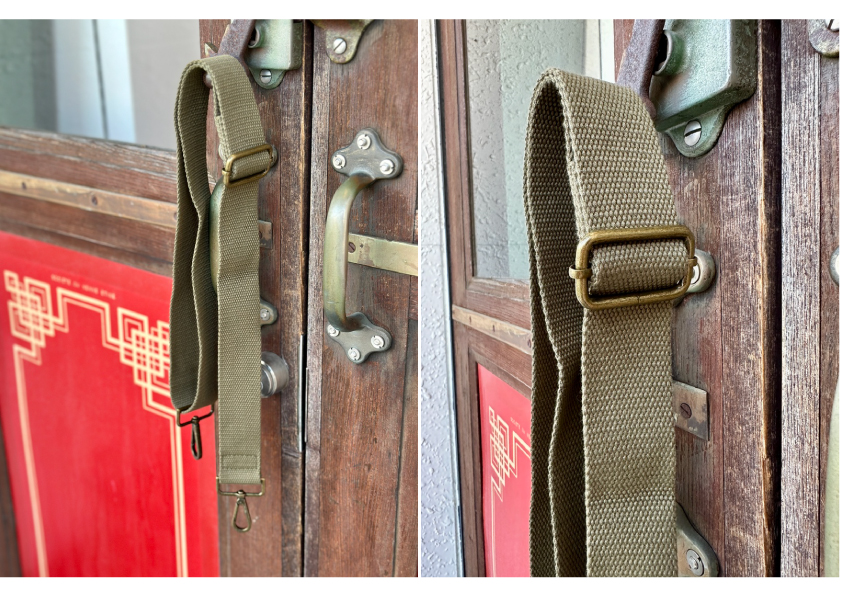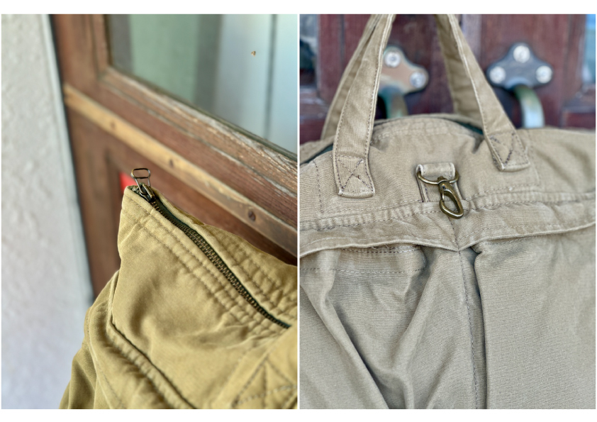The material used is a thick cotton canvas that has been washed to soften the fabric and give the color a slightly worn look, creating a natural look for the bag.
