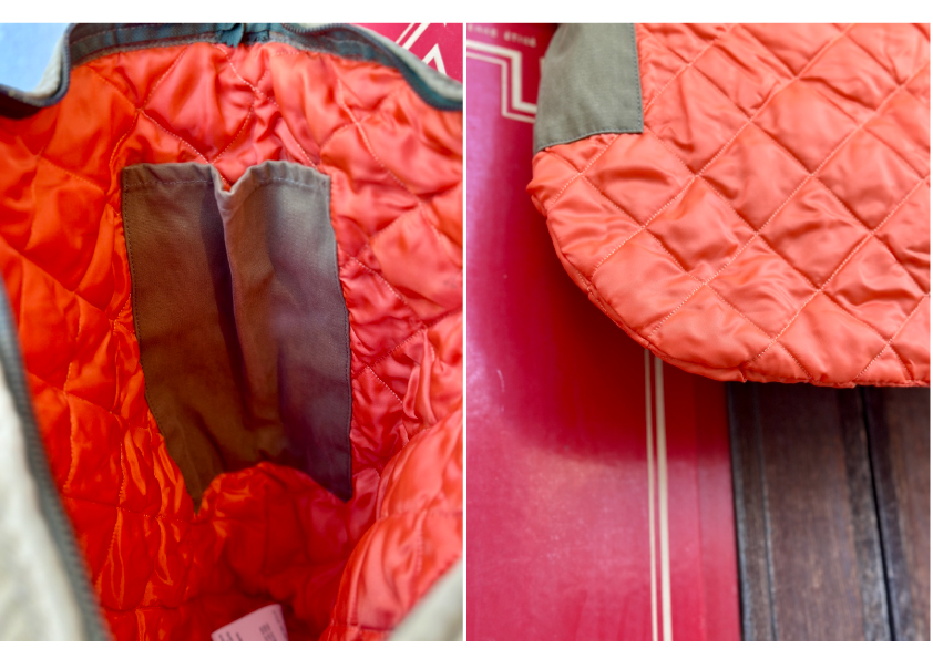 The main compartment has orange quilted lining and has pockets on both sides.