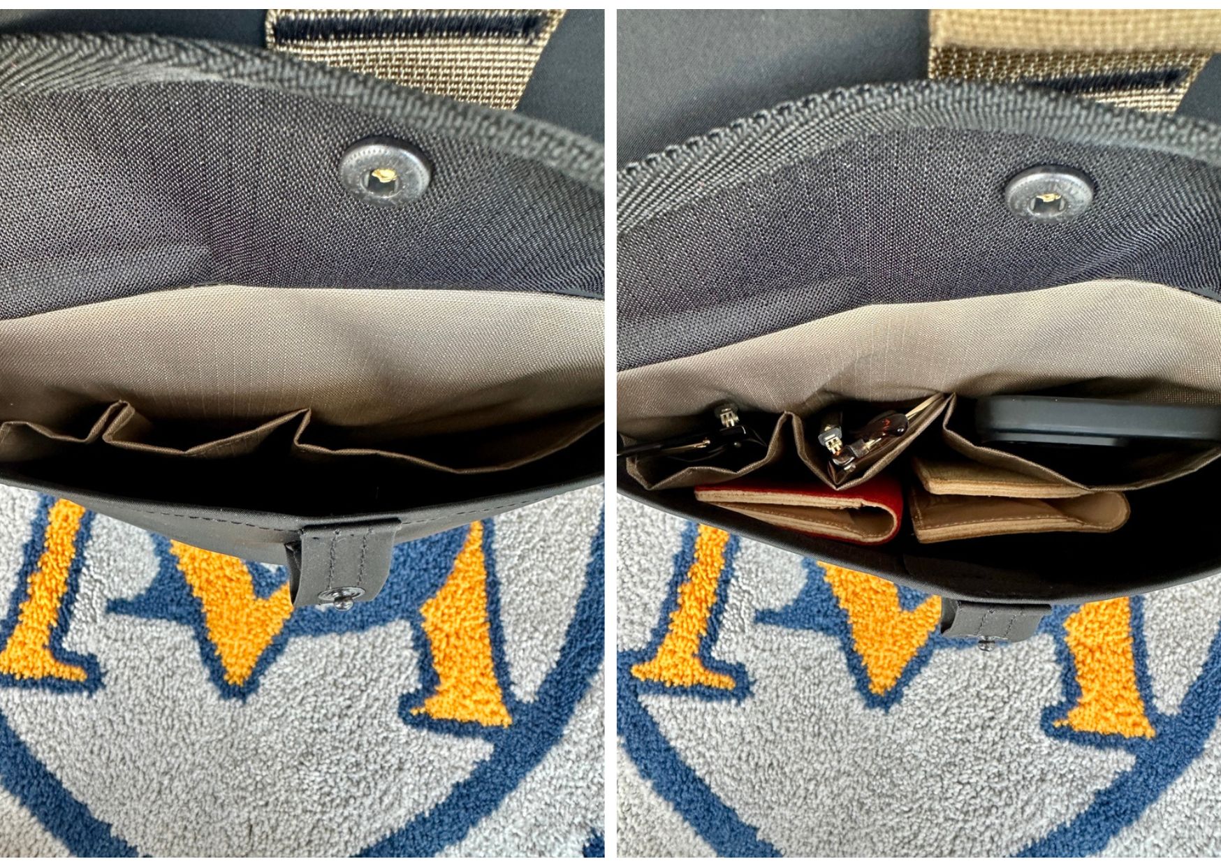 外側にはフラップ付きポケットとサイドエントリー式ジッパーポケットを重ね