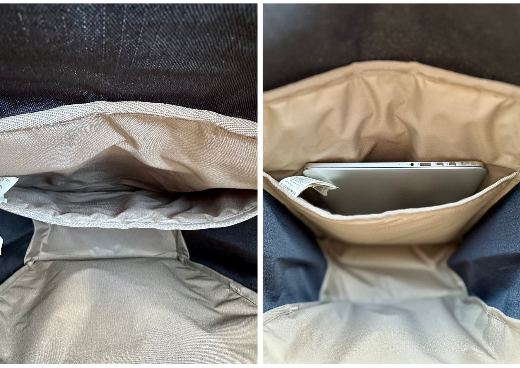 メインコンパートメント部分はロールトップ式で水の侵入も防ぎながらも
