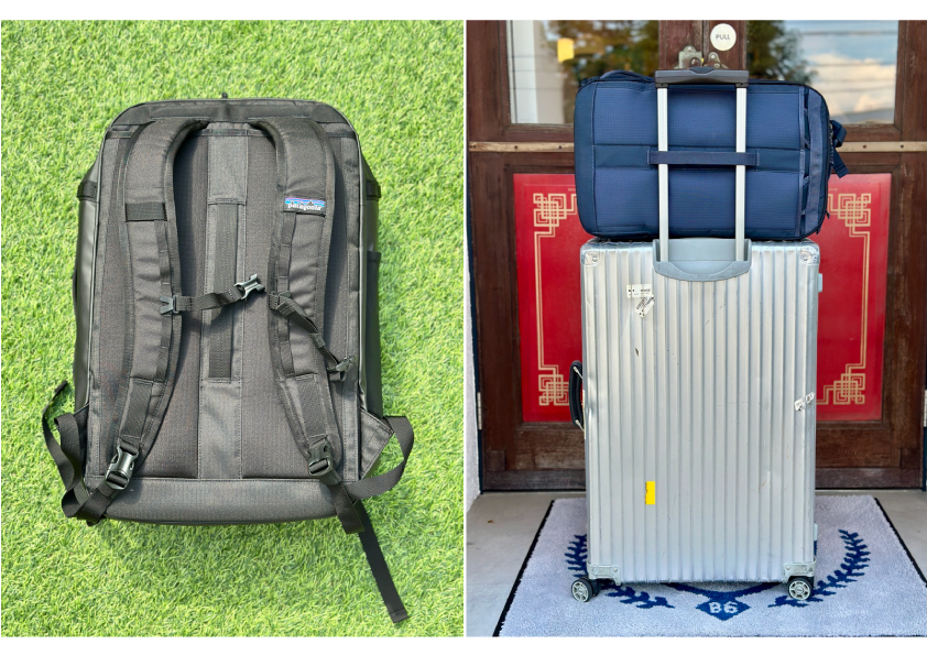 背部にはトローリ―ケースのラゲージハンドルに通して一体化もでき非常に持ち運びが便利です。