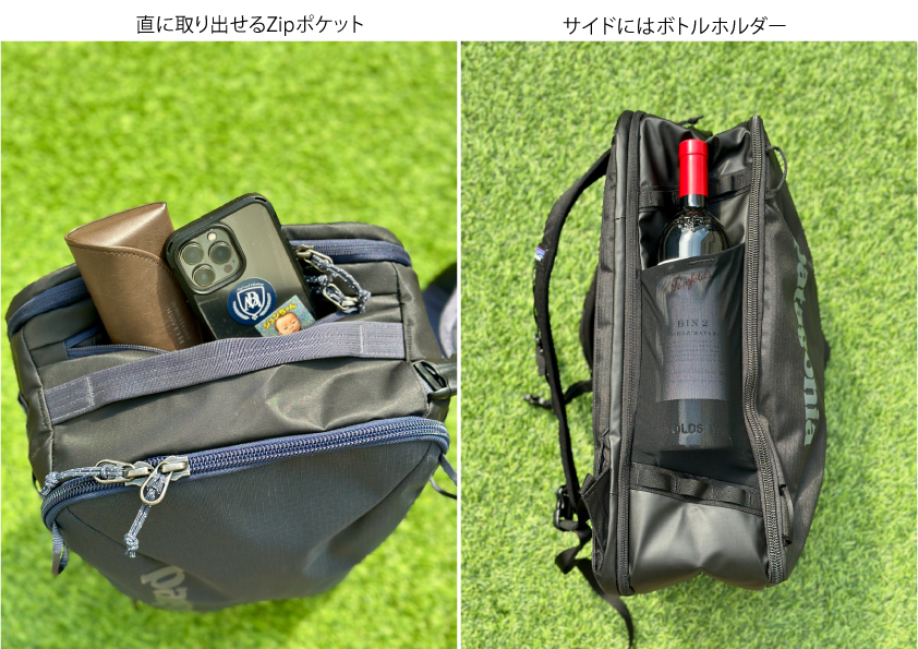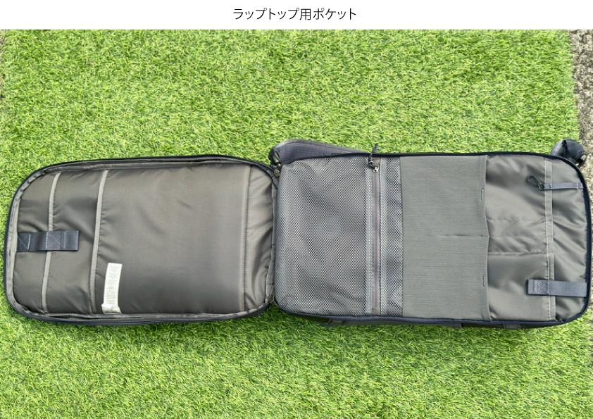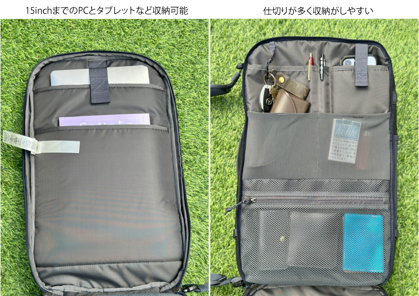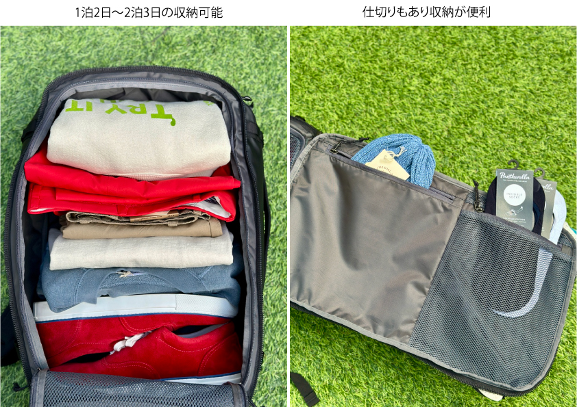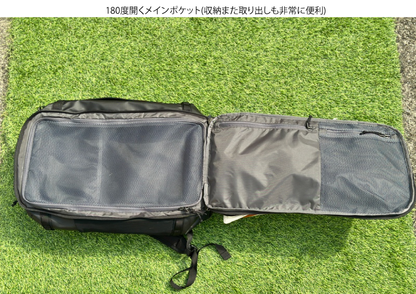収納もメインコンパートメントは180度開き容量も30Lで逆側にはちょっとした小物などを