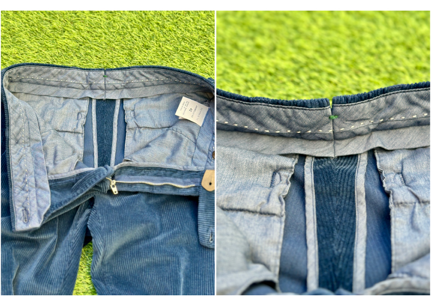 The back pocket buttons are designed so that there is no button on the left side and a button on the right side, and the button stitching is also the iconic BERWICH double stitch.