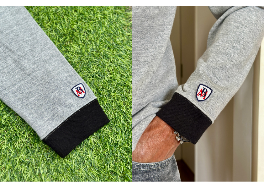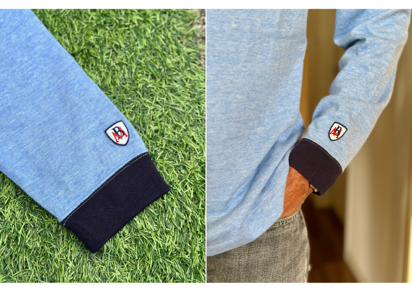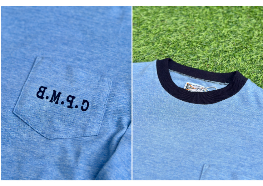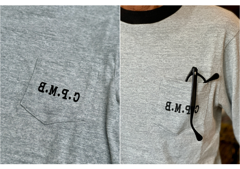 The details include ringers in the same color at the neck and cuffs, and a reversed print of "B.M.P.C." on the chest pocket.