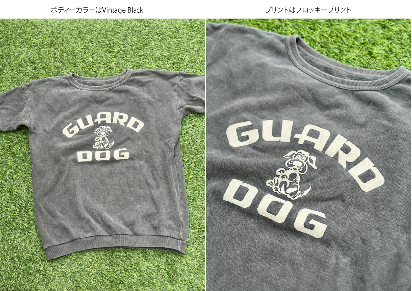 今回の別注ではVintage Blackのボディーを使用し、プリントにはフロッキープリントを施した1枚になります。