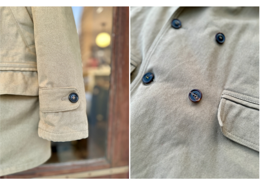 釦も本水牛の艶消し釦を使用しており、襟元にはリアルムートンを使用しており