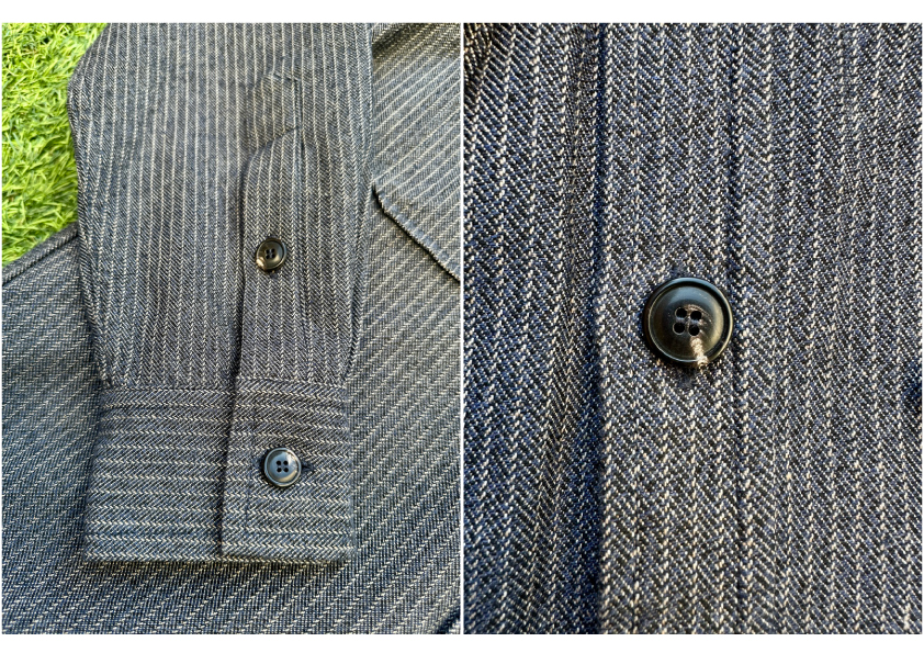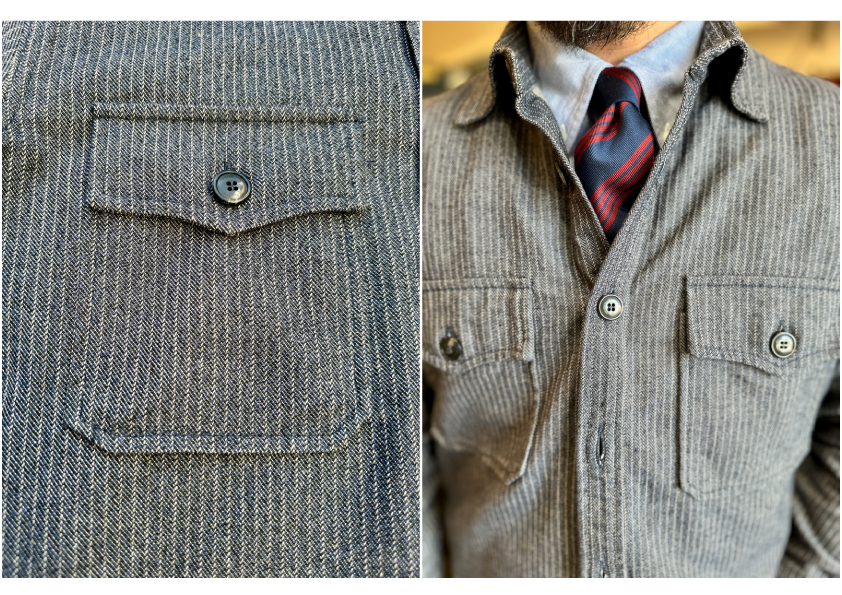 The details are similar to a CPO jacket, with patch pockets with flaps on both sides and buttons made from genuine water buffalo.